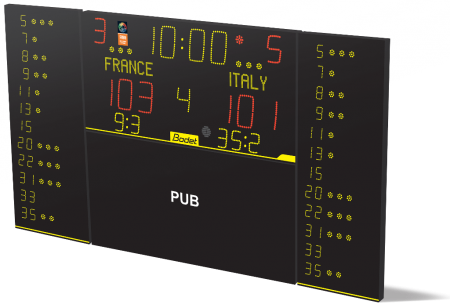 | Display | Game clock – Time , Game clock stop indicator, Scores, Period number , Time out countdown, Time out indicators, Team fouls , Individual fouls , Programmable teams’ names, Won sets |