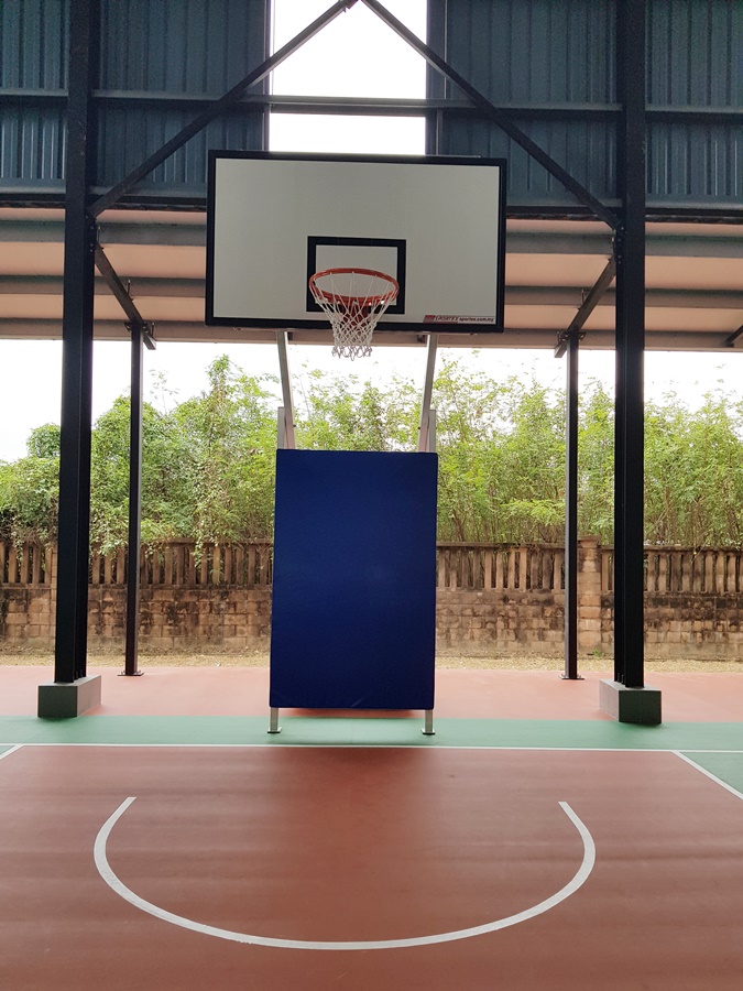 The basketball padding is made from a foam core and a PVC cover on an aluminium structure. The aluminium structure can be hooked on the mobile basketball post. The padding measures a height of 2.0 m and a width of 1.2 m. It has thickness of 50 mm.