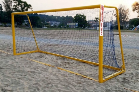 The portable beach soccer goal post is made of high-grade aluminium profiles. The inside dimension of this goal are 5.5×2.2 m. The front frame of the goal is made from oval 120x100x2.5 mm profile. The bottom frame is made from a rectangular hollow 80x60x3 mm.The top projection of the goal is 0.8 m.The lower projection can be chosen between three options (1.0 m, 1.5 m, and 2.0 m).The goal is completely powder coated in