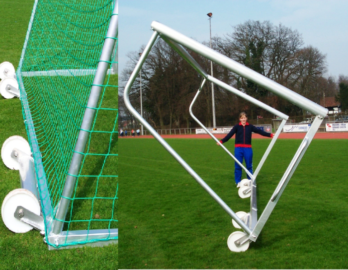 The counterweights are made from aluminium. The weights are fixed on the back side of the bar frame. The weights provide sufficient weight to prevent the goal from toppling over in accordance with the EN standard. The wheels for the counterweights are made from polyamide. They measure a diameter of 200 mm. The wheels are used to move the goal around comfortably.