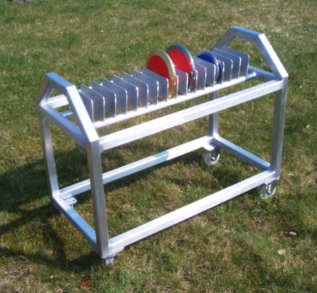 The discus rack is made from aluminium. The sturdy construction is welded in one piece. The turning wheels increase the handling comfort of this rack. It provides space for up to 14 discuses.