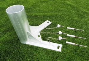 The mobile floor apparatus for netball post is made from aluminium. It is used in locations where no ground sockets can be installed.