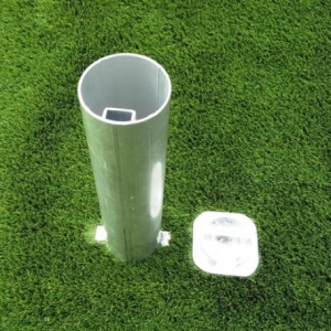 The standard ground socket for the netball post is made from aluminium. The socket is designed to match the round tube with a diameter of 80 mm of the netball post. The cover of this socket cannot be coated. It measures a total length of 400 mm. The insertion length is 350 mm. The ground socket is equipped with a compartment to store possible soiling without effecting the height of the post.