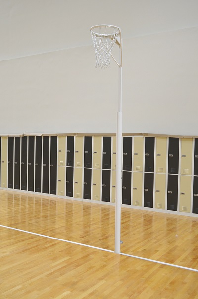 The netball upright in ground sockets is made from a special aluminium profile. The post measures a diameter of 80 mm. The ring is manufactured from a 16 mm solid round and measures an inside diameter of 380 mm. The ring is separated from the post. Therefore, the height and the direction of the ring can be adjusted to the condition on site. The ring comes together with a 6 mm thick nylon net. The post confirms with
