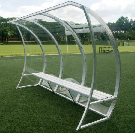 The player cabin ECO 1 is made from high grade aluminium profiles. The structure is made from square hollow profiles with a cross section of 40x40x3 mm. The back side of the player cabin is closed with polycarbonate sheets. The sheets are mounted in a special support profile, which have a groove to mount them. All seating profiles are powder coated. The cabin measures a height of 2.2m with a roof overhang of 15 cm. The bottom depth of the cabin is 83 cm. The player cabin is manufactured in one piece. For export, the cabin is also available in a dismantled version. On request, the whole cabin can be powder coated. The cabin is available in various lengths.