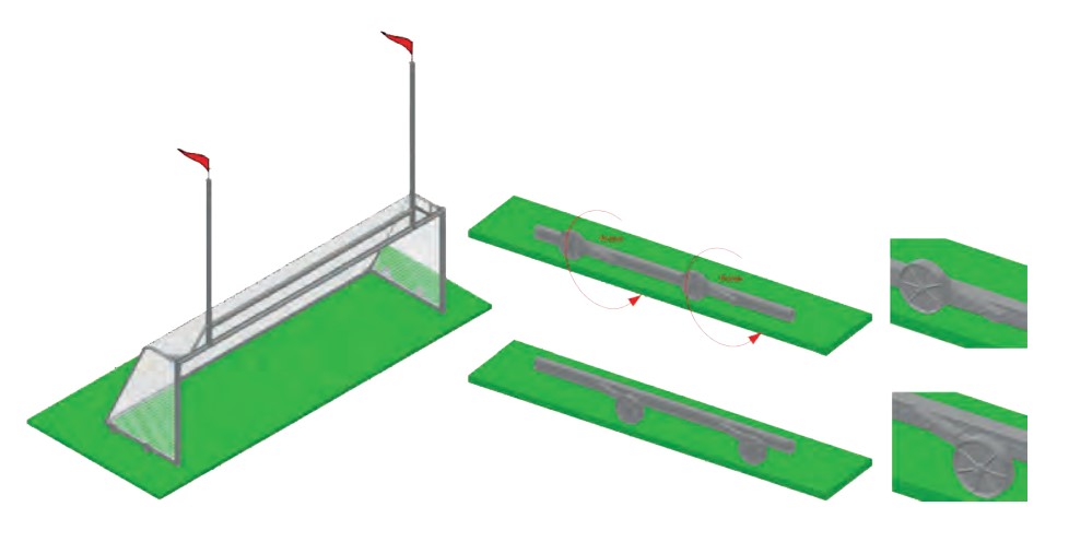 The practice soccer goal with rugby is made from special aluminium profiles. The inside dimension of this goal are 7.32×2.44 m. The front frame of the goal is made from oval 120x100x2.5 mm profile. The bottom frame is made from a rectangular hollow 80x60x3 mm. The top projection of the goal is 0.8 m. The lower projection measures 2.0 m. It is equipped with the INTERLOCK net hook system, which ensures that the nets hangs perfectly. The total height of the rugby goal post is 6.50 m. The goal is equipped with transport wheels.