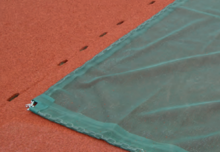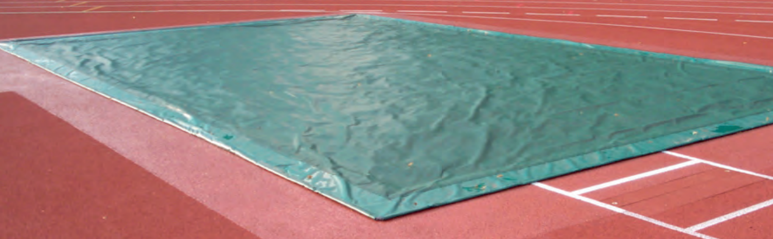 The long jump sand pit cover is made from PVC coated netting fibre. The used material is spike proof. The cover is surrounding by a steel link chain. The cover weighs roughly 400 g/sqm. The items are manufactured exactly in the size of the sand pit for an optimum coverage.