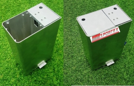 The special ground socket for the water ditch hurdle is made from aluminium. The socket is designed to match the square hollow profile 80×80 of the water ditch hurdle. The cover of this socket can be coated be coated with the surrounding material. It measures a total length of 400 mm. The insertion length is 350 mm. The ground socket is equipped with a compartment to store possible soiling without effecting the height of the post. If ordered together with the water ditch kit, the sockets are welded directly to the kit.