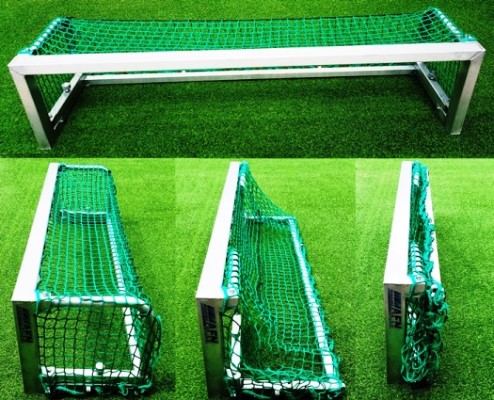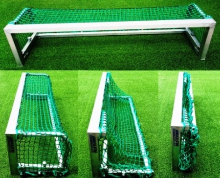 The mini soccer goal post is made from special aluminium profiles. Dimension 1800 mmx 400 mm. Projection 450 x 450 mm. it is foldable and easy for storage and transportation. The profiles for the front frame are square hollow with a cross section of 75x50x6 mm (which significantly reduces denting due to ball impacts). The profile is equipped with an integrated net suspension system. The bar frame is made from a 40x40x3 mm square hollow. The goal is available fully welded or dismantle for export.